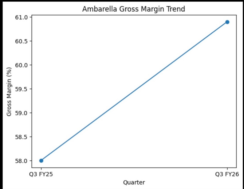 In Q3 of fiscal year 2026, Ambarella delivered another quarter of strong top-line performance, reporting record revenue of $108.5 million, up 31.2% year-over-year and exceeding both the prior guidance range and consensus expectations. This robust growth was accompanied by healthy profitability metrics, with non-GAAP earnings per share of $0.27 and a non-GAAP gross margin of approximately 60.9%, reflecting an improving product mix and solid execution. On the balance sheet, Ambarella strengthened its liquidity position, ending the quarter with about $295 million in cash, cash equivalents, and marketable securities and generating roughly $31.4 million in free cash flow, underscoring strong cash conversion alongside accelerating revenue. Management also raised FY26 revenue guidance to a 36–38% annual growth range, signaling confidence in continued demand momentum across edge AI and related segments. The return of operating leverage is increasingly evident as revenue growth outpaces expense growth: higher unit volumes, a rising mix of advanced AI-centric system-on-chips, and improving average selling prices have driven greater absorption of fixed costs and expanded margins, positioning Ambarella to scale more profitably while investing in strategic growth areas.